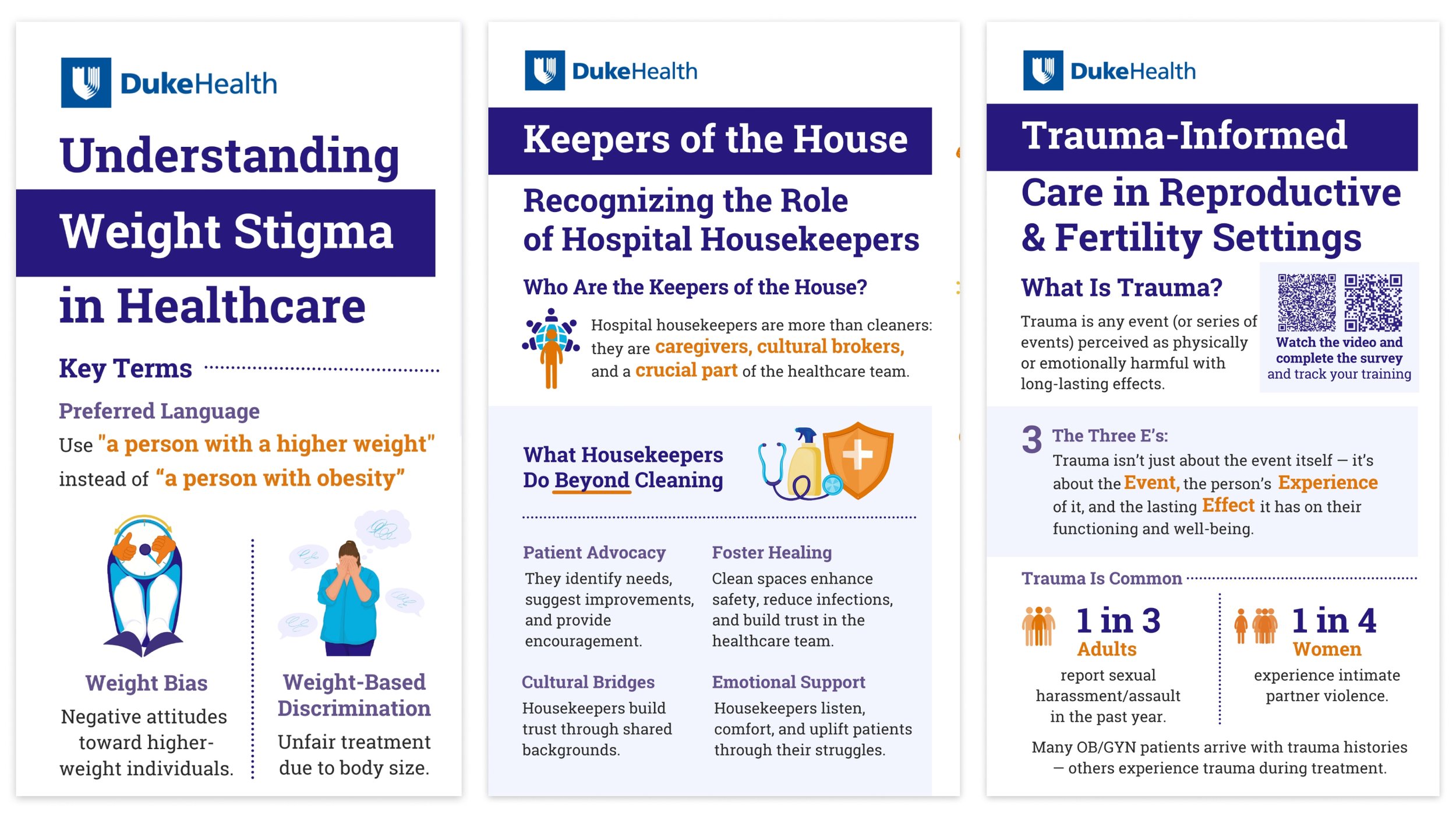 Duke Health needed educational tools that could turn complex and sensitive healthcare topics into clear, usable guidance for care teams. We partnered to design a series of infographics focused on provider education, addressing weight stigma in healthcare, trauma-informed reproductive and fertility care, and the essential role of hospital housekeepers. This work builds on our experience creating healthcare training and education tools designed for real-world clinical environments.